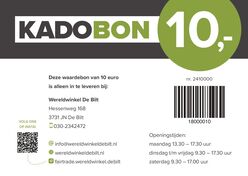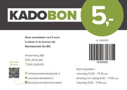 Als het te moeilijk is om in onze winkel een passend cadeau te kiezen, kun je iemand ook blij maken met onze cadeaubonnen. Deze zijn verkrijgbaar in coupures van € 5,- en € 10,-. Ze zijn onbeperkt geldig, maar alleen in onze eigen winkel inwisselbaar.